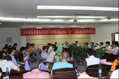 7月2日下午,共青團廣西區(qū)委、廣西青年聯(lián)合會、廣西學生聯(lián)合會和廣西區(qū)少工委在南寧召開座談會,認真學習領(lǐng)會胡錦濤總書記在慶祝中國共產(chǎn)黨成立90周年大會上的重要講話精神,并圍繞進一步為黨做好新形勢下的青年群眾工作進行了交流討論。