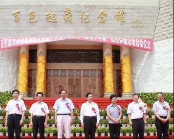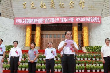 在當(dāng)天“重走小平路”啟動活動中,團(tuán)區(qū)委書記李澤宣讀了倡議書。團(tuán)區(qū)委機關(guān)及直屬單位干部職工、青聯(lián)委員、青年企業(yè)家代表及百色市各界青少年代表2000多人作為首批隊伍參加了紅色體驗。上午,在百色起義紀(jì)念碑前舉行主題教育活動,向革命烈士敬獻(xiàn)了花籃,重溫了入黨誓詞,上了一堂特殊的黨課。下午,青少年代表參觀了百色起義紀(jì)念公園、百色起義英雄雕塑園,少先隊員們還開展了“在光榮的旗幟下成長”主題隊會。此項活動由共青團(tuán)廣西區(qū)委、自治區(qū)旅游局、自治區(qū)發(fā)改委、自治區(qū)教育廳、自治區(qū)高校工委、自治區(qū)黨委黨史研究室、自治區(qū)黨校聯(lián)合主辦,活動將歷時一年半的時間,以“開展一次紅色體驗活動、舉辦一次主題巡回宣傳、組織一次感悟活動、參與一次‘紅色網(wǎng)絡(luò)游’,以及舉行攝影、攝像、征文等一系列大型主題活動”等“五個一”為內(nèi)容,向全區(qū)青少年推薦遍布全區(qū)109個縣(市、區(qū))的110條紅色體驗線路、300個紅色景點景區(qū)以及體驗項目和一批紅色網(wǎng)站,通過共青團(tuán)和相關(guān)部門的組織推動、旅行社的市場運作以及青年自發(fā)組織和社會群眾廣泛參與等方式,動員組織全區(qū)青少年積極參加到活動中來。