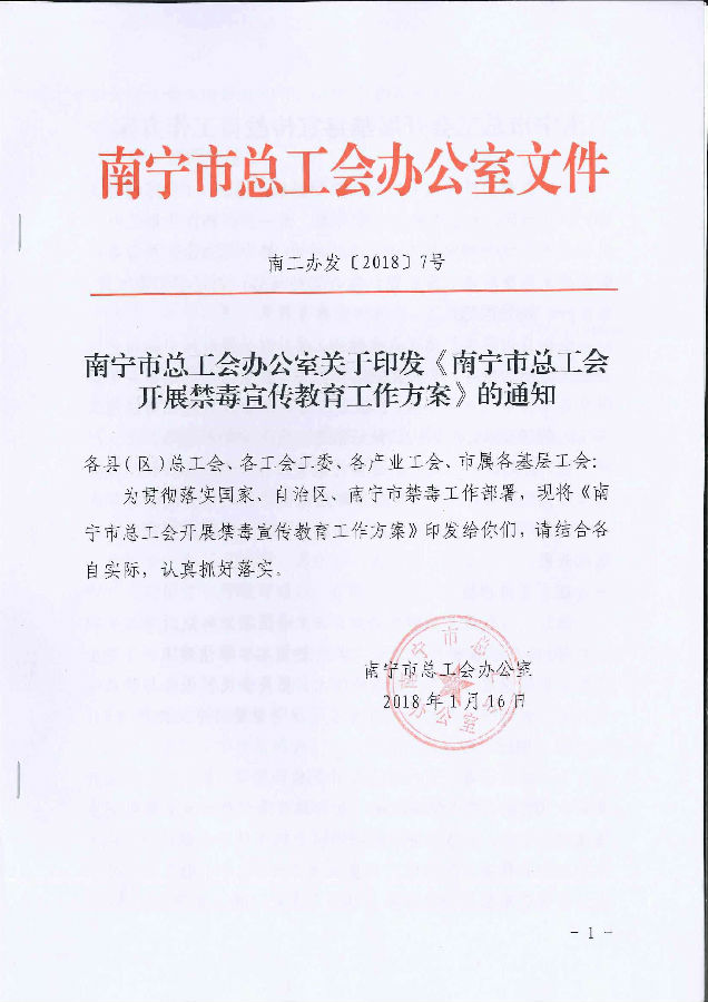 南寧市總工會辦公室關(guān)于印發(fā)《南寧市總工會開展禁毒宣傳教育工作方案》的通知
