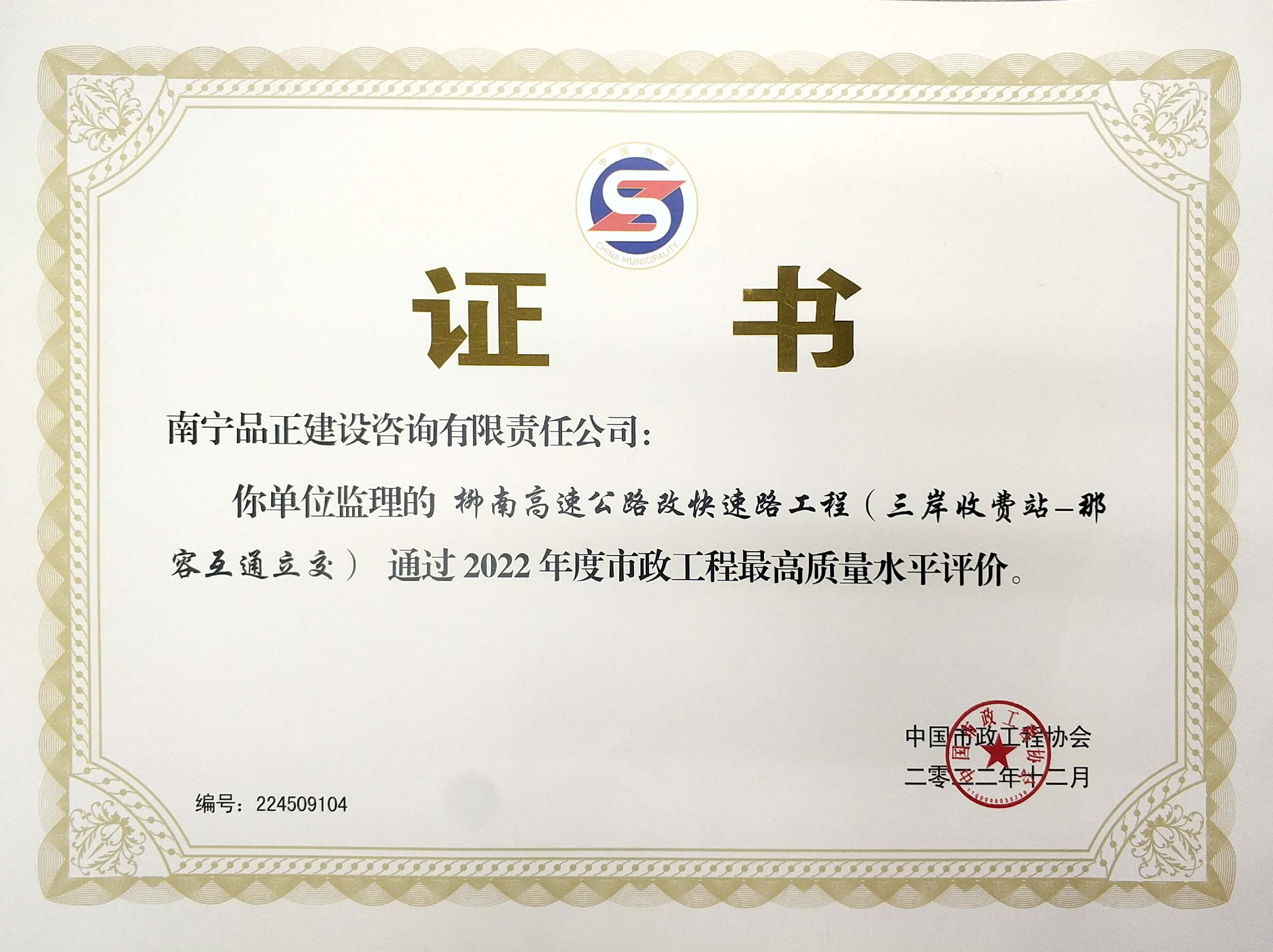 南寧品正建設(shè)咨詢有限責(zé)任公司監(jiān)理的柳南高速公路改快速路工程(三岸收費(fèi)站-那容互通立交)獲“市政工程最高質(zhì)量水平評(píng)價(jià)”(原國(guó)家市政工程金獎(jiǎng))榮譽(yù)!市政工程最高質(zhì)量水平評(píng)價(jià)由中國(guó)市政工程協(xié)會(huì)評(píng)選,是市政工程行業(yè)在工程質(zhì)量方面最高的質(zhì)量水平評(píng)價(jià),代表市政工程行業(yè)同時(shí)期國(guó)內(nèi)先進(jìn)水平。