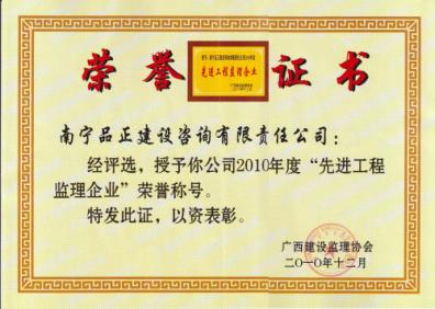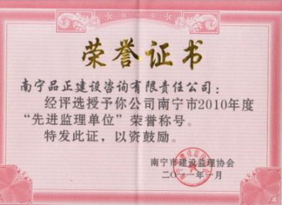 2010年12月,南寧品正獲得廣西建設監(jiān)理協(xié)會、南寧市建設監(jiān)理協(xié)會分別頒發(fā)的廣西2010年度“先進工程監(jiān)理企業(yè)”、南寧市2010年度“先進監(jiān)理單位” 榮譽稱號。公司總工程師陳秋獲得廣西“優(yōu)秀總監(jiān)理工程師” 榮譽稱號,盧天昌、萬立名獲得廣西“優(yōu)秀監(jiān)理工程師”榮譽稱號。陳秋、張學群、曾振華、馮人杰、萬立名獲得南寧市“優(yōu)秀總監(jiān)理工程師”榮譽稱號。姚思清、黃燕玲、賴建華、李風雷、盧天昌獲得南寧市“優(yōu)秀監(jiān)理工程師”稱號。