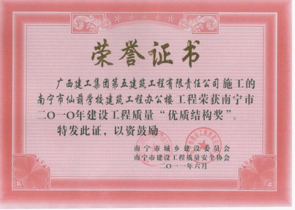 南寧市仙葫學校建筑工程辦公樓榮獲南寧市二〇一〇年建設(shè)工程質(zhì)量“優(yōu)質(zhì)結(jié)構(gòu)獎”榮譽證書